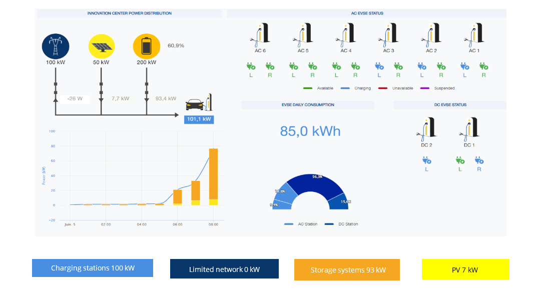 Di conseguenza, l'Innovation Center funziona oggi come un edificio prosumer: utilizza l'accumulo di energia per separare le esigenze di ricarica dei veicoli elettrici dai vincoli della rete e per ottimizzare l'impiego delle fonti rinnovabili locali.