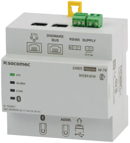 Descrizione Communication gateway interface for DIRIS Digiware system DIRIS Digiware M-70 with Ethernet gateway, embedded WEBVIEW-M web server (with Bluetooth connectivity) and Modbus communication protocols